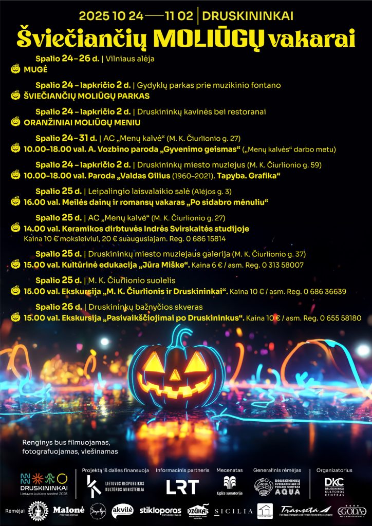 Tai – šilta rudens tradicija, kai visa Druskininkų bendruomenė: mokyklos, darželiai, įstaigos, restoranai, šeimos, draugų kompanijos ir kolektyvai susiburia kurti švytinčių moliūgų stebuklą. Iš paprastos rudens daržovės gims šviesūs, linksmi ir jaukūs kūriniai, kviečiantys pasidžiaugti rudeniu ir pabūti drauge.