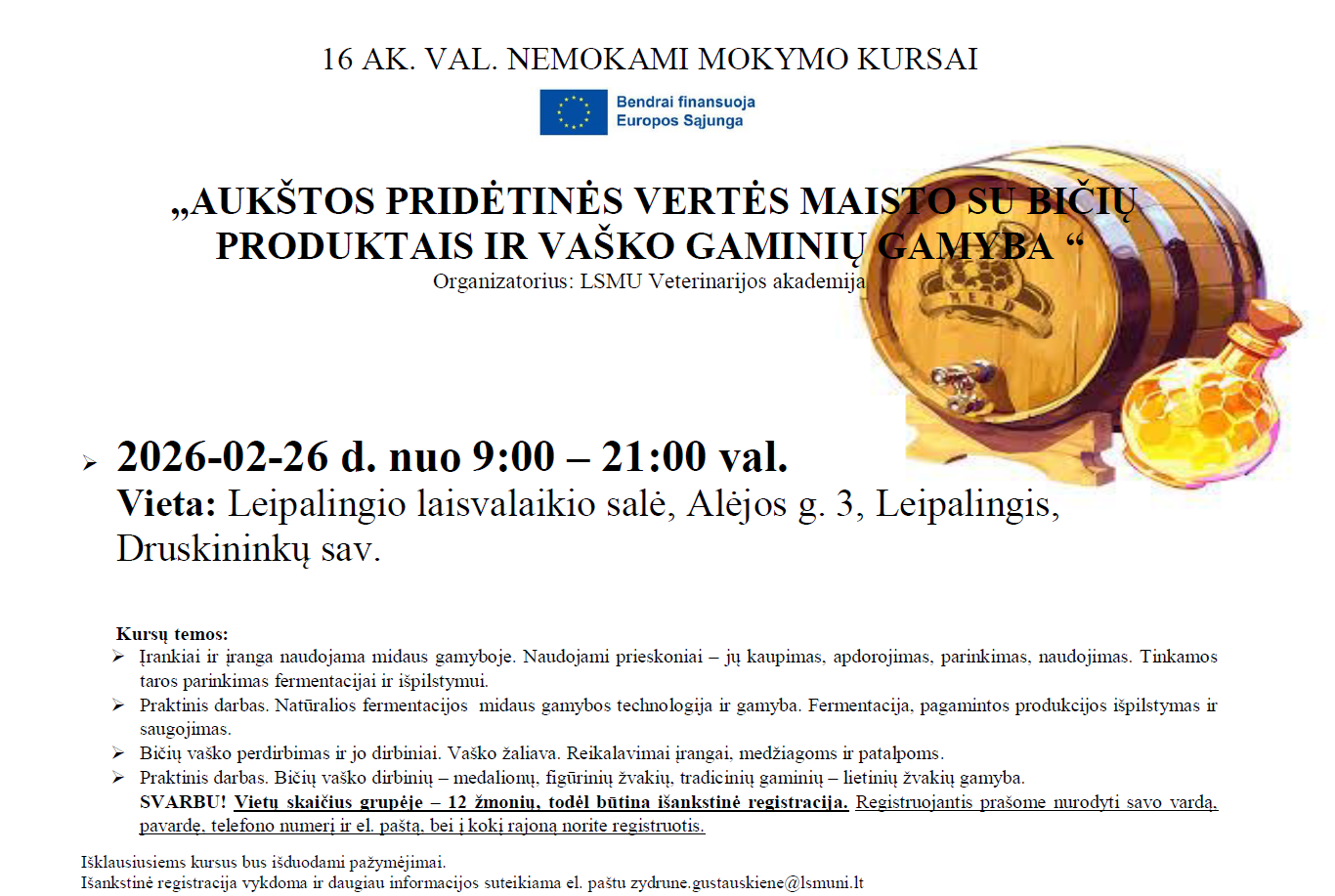 Kvietimas į nemokamus mokymo kursus „Aukštos pridėtinės vertės maisto su bičių produktais ir vaško gaminių gamyba“