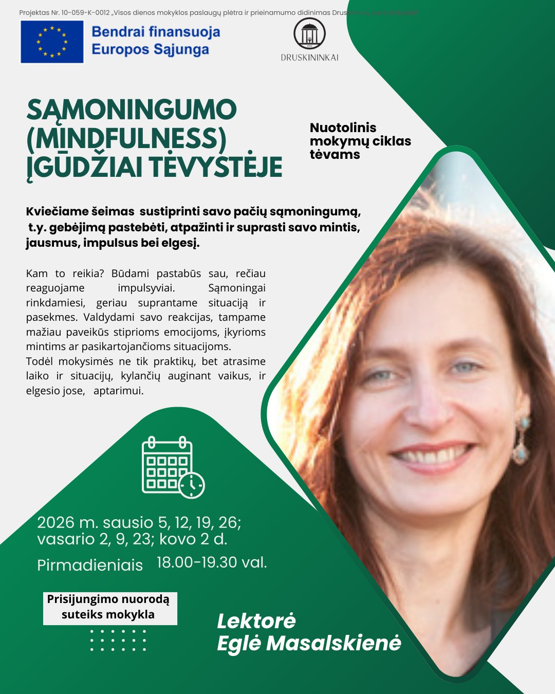 Mokymus ves lektorė, psichologė, mindfulness mokytoja/instruktorė Eglė Masalskienė. Mokymai vyks sausio 5, 12, 19, 26; vasario 2, 9, 23; kovo 2 d. (pirmadieniais) 18.00-19.30 val. (kvietimas pridedamas)