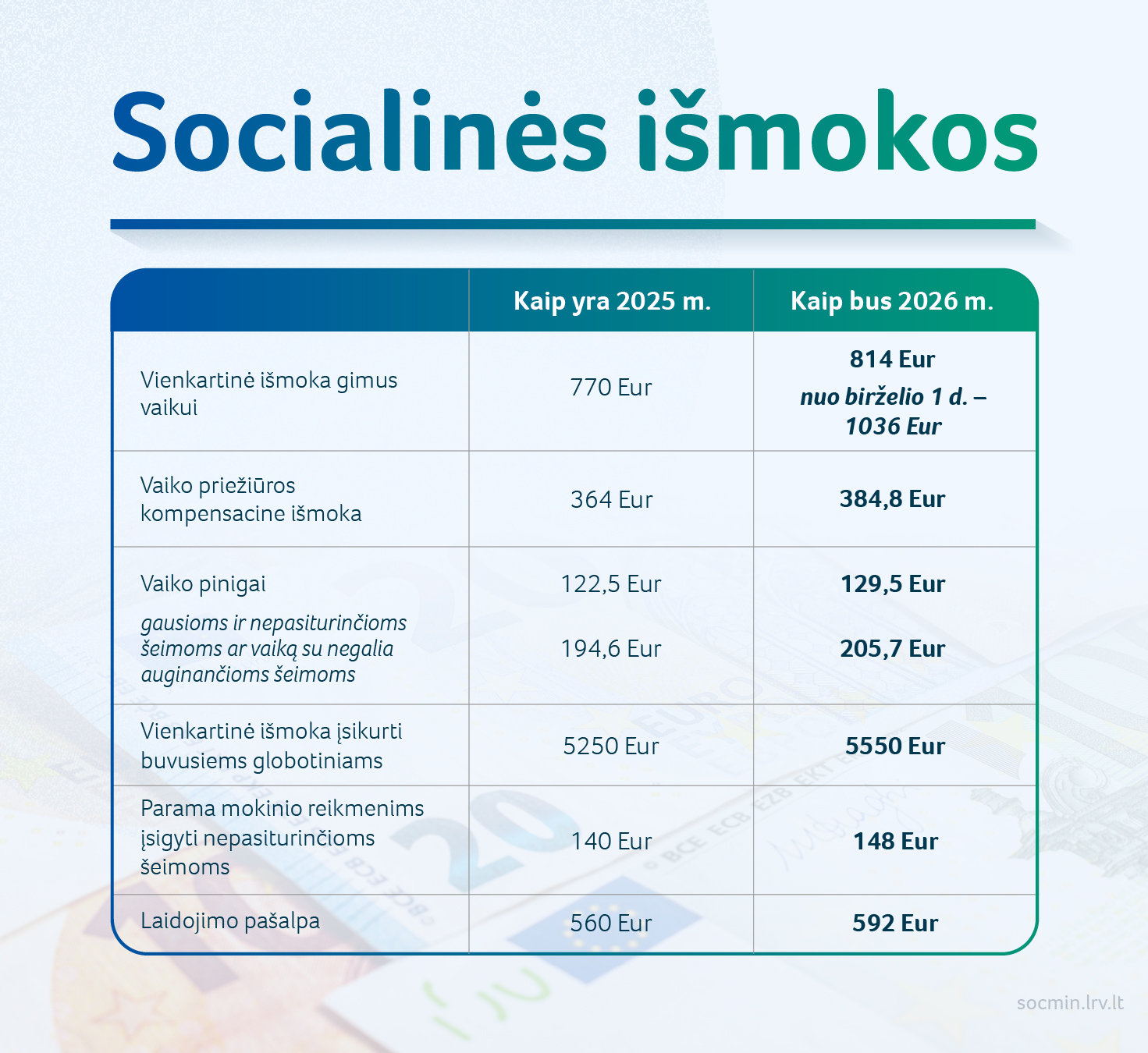 Bazinė socialinė išmoka didinama 5,7 proc. iki 74 eurų (dabar – 70 eurų). Su šiuo dydžiu yra susijusios visos išmokos, mokamos pagal Išmokų vaikams įstatymą. Pavyzdžiui, išmoka vaikui (vaiko pinigai) padidės nuo 122,5 iki 129,5 euro, o gausioms ir nepasiturinčioms šeimoms ar vaiką su negalia auginančioms šeimoms mokama išmoka vaikui (vaiko pinigai) kartu su papildoma dalimi – nuo 194,6 iki 205,7 euro. Vienkartinė išmoka vaikui augs nuo 770 iki 814 eurų, o nuo 2026 m. birželio 1 d. – iki 1036 eurų.