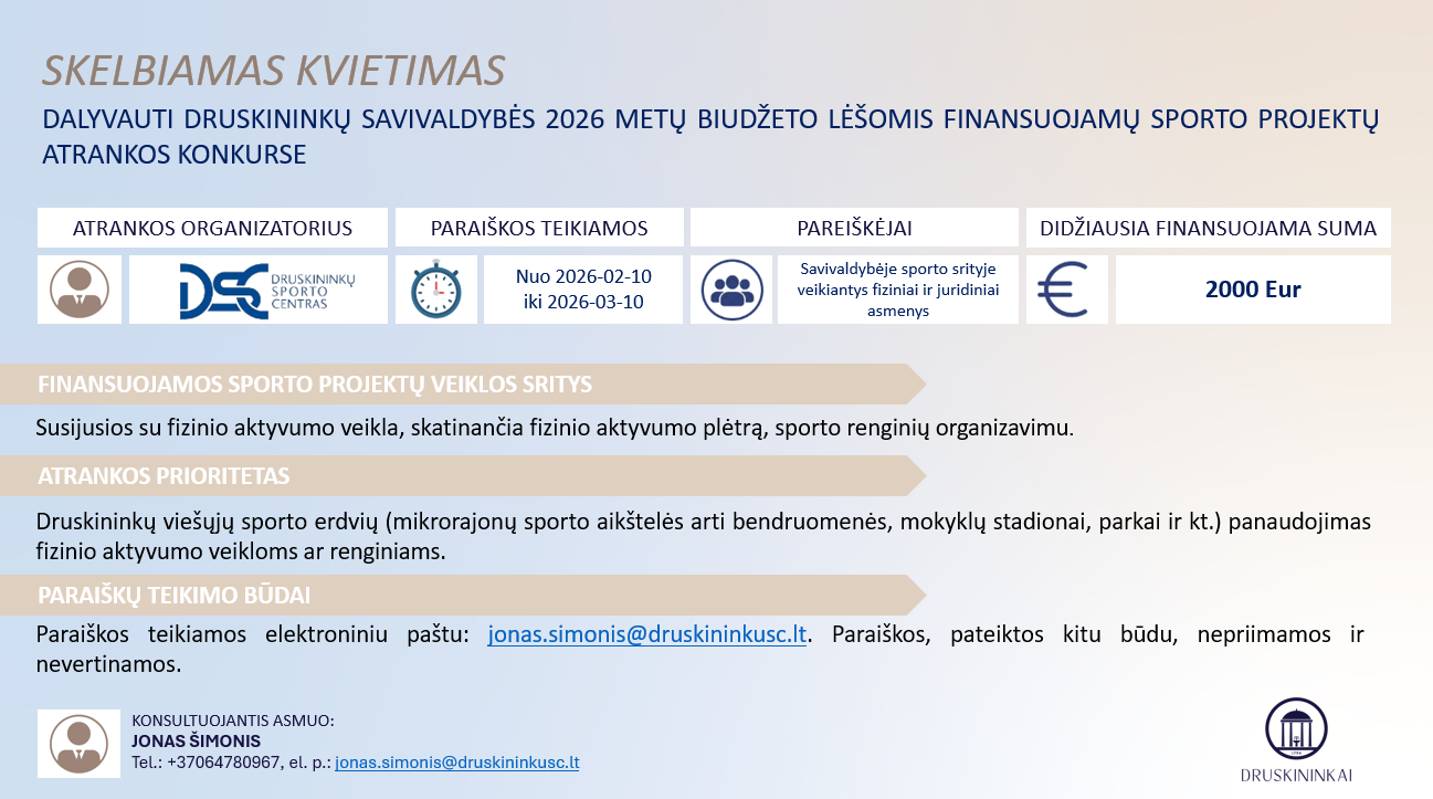 Sporto srities projektais siekiama Druskininkų savivaldybės bendruomenę įtraukti į fizinio aktyvumo veiklas,skatinti fizinio aktyvumo plėtrą,