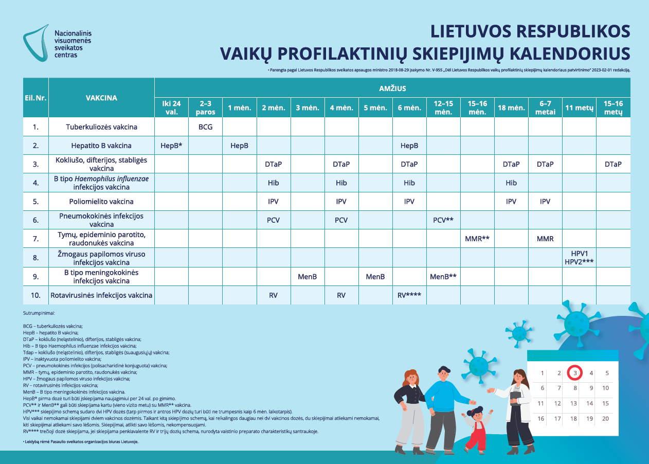 1. Sutrumpinimai: BCG – tuberkuliozės vakcina; HepB – hepatito B vakcina; DTaP – kokliušo (neląstelinio), difterijos, stabligės vakcina;